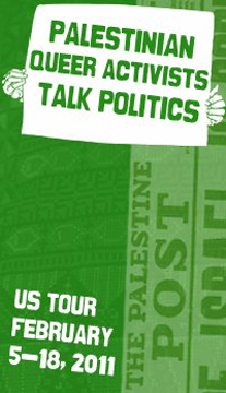 SS: I talked about why I declined and I talked about homophobia in the family, which everyone can relate to. Then I spoke at the Haifa Women’s Center and with a Palestinian lesbian organization and an Israeli Jewish women’s peace group. I went to the West Bank, met an LGBT group and spoke to the people organizing the boycott. I told them my concerns about them not being supportive enough of gay people. From this meeting the queers I met and I decided I would organize a trip for them to come to America and speak to the LGBT community here because people don’t know there is a Palestinian queer movement, or don’t understand there is a secular, pro-gay, feminist, sector of Palestinians who are supporting economic sanctions as a non-violent strategy for change. We should be supporting these people so I wanted to introduce them to the gay community here. Since last April, it is now February; I have organized six cities to host them with different public events.